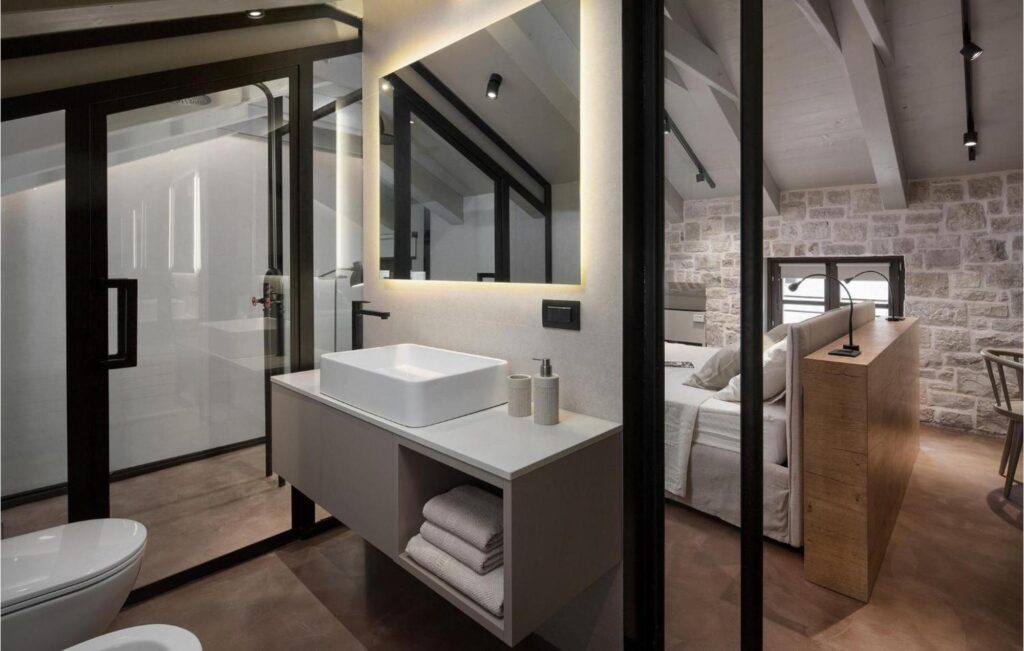 Various local amenities are also within walking distance, including the nearest stunning beach which is only 50m away. The elegant and above all interesting interior design of the villa creates and especially warm and welcoming atmosphere with an air of luxury. With a living space of 120 m2, Villa Euphrasiana features two spacious bedrooms equipped with double beds. Both bedrooms have a comfortable ensuite bathroom with a shower enclosure.