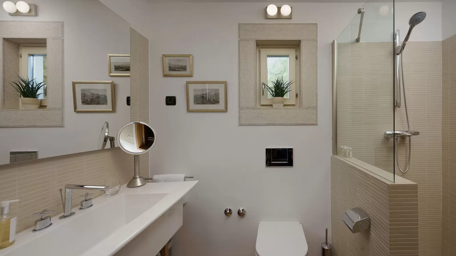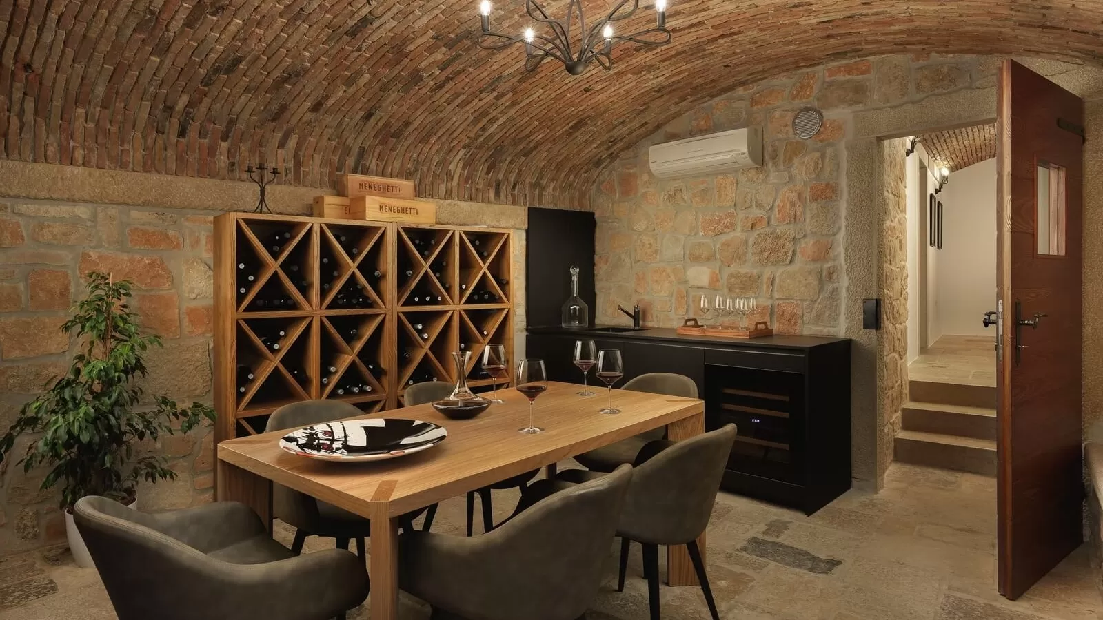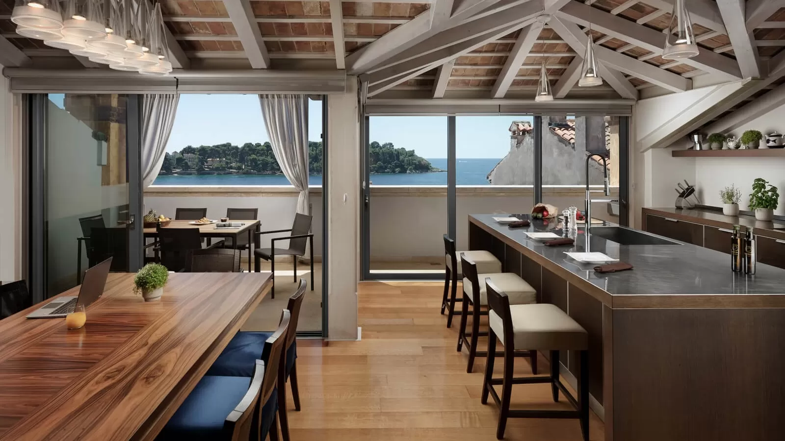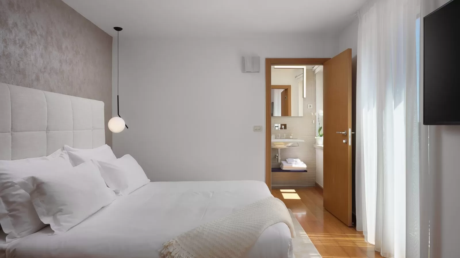 Enjoy the magical sunsets, stroll through the narrow streets of the old town in the evening and enjoy the flair of a former fishing village. Villa Malipiero Residence consists of several floors, each of which is special in its own right. On the first floor you will find the well-equipped fitness room and the wellness area with sauna and a bathroom. Relax here or work off some energy while exercising. Level 2 consists of 2 comfortable bedrooms and 2 modern en-suite bathrooms. On the third level you will find 2 further bedrooms, each with its own bathroom, a vinotheque with a small kitchen and dining table for 6 people. Level 4 has the living area with kitchen and dining area, a library and an outdoor terrace. Here you can enjoy a wonderful view of the sea.