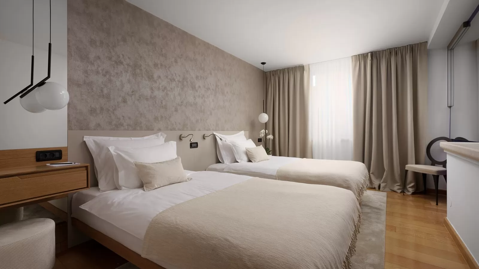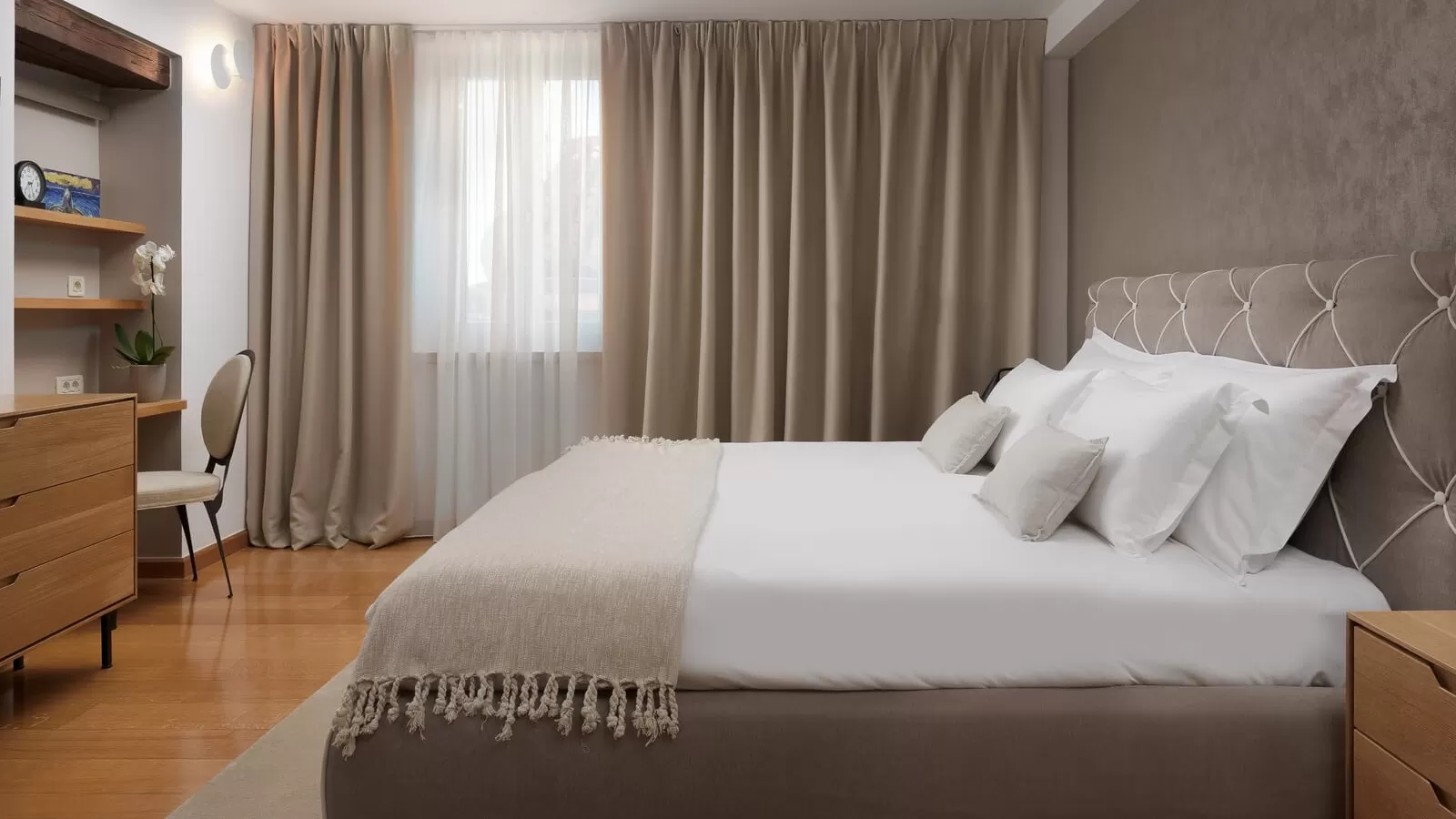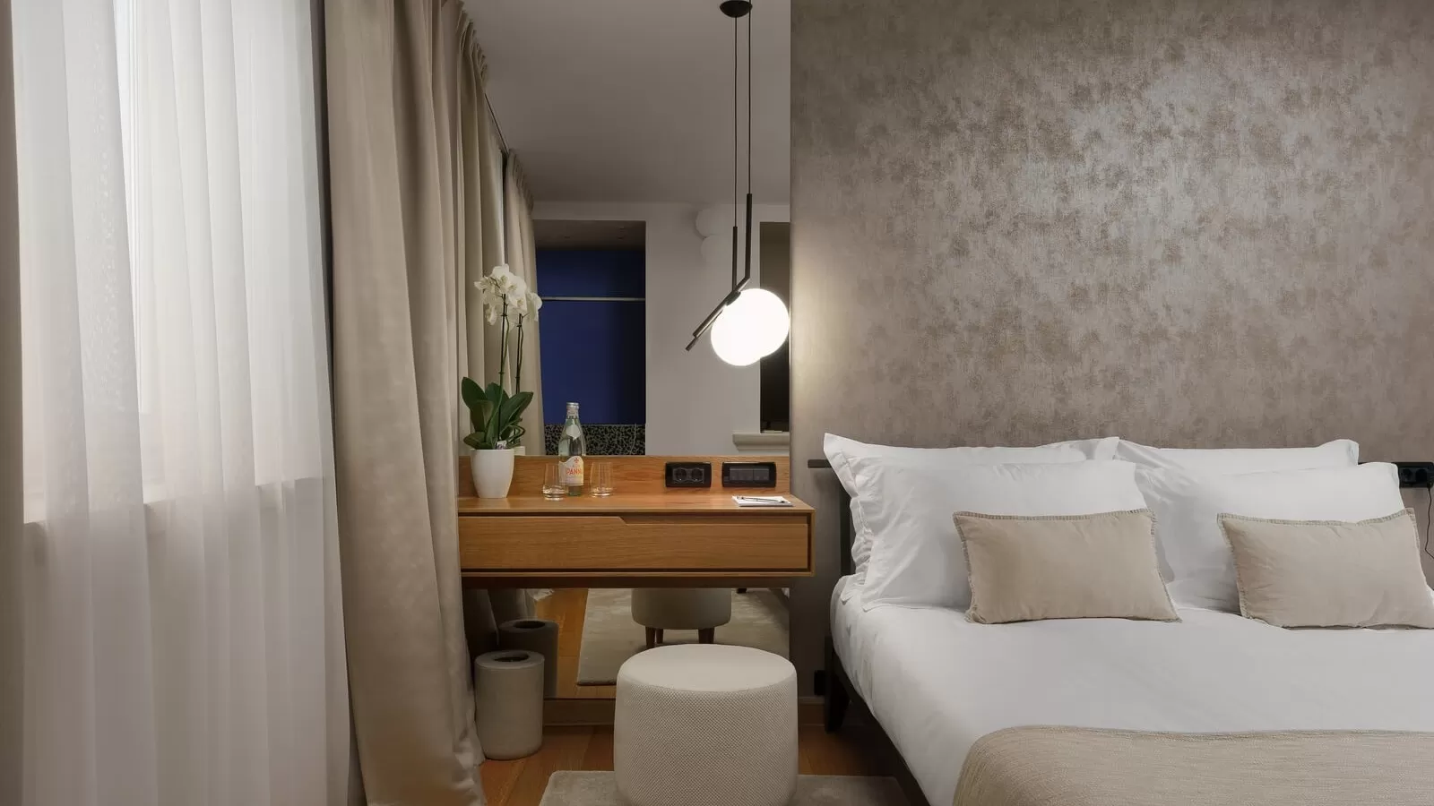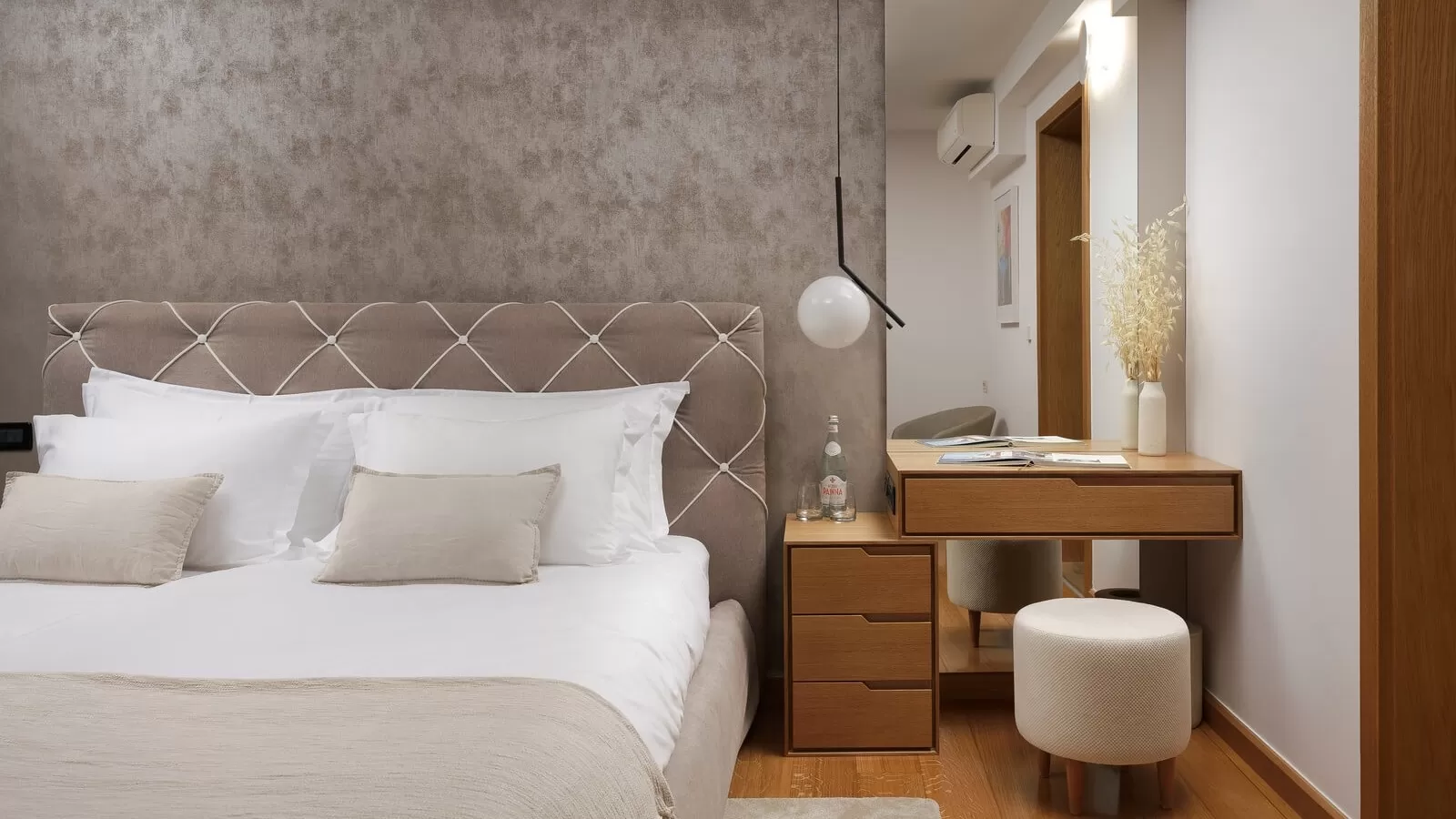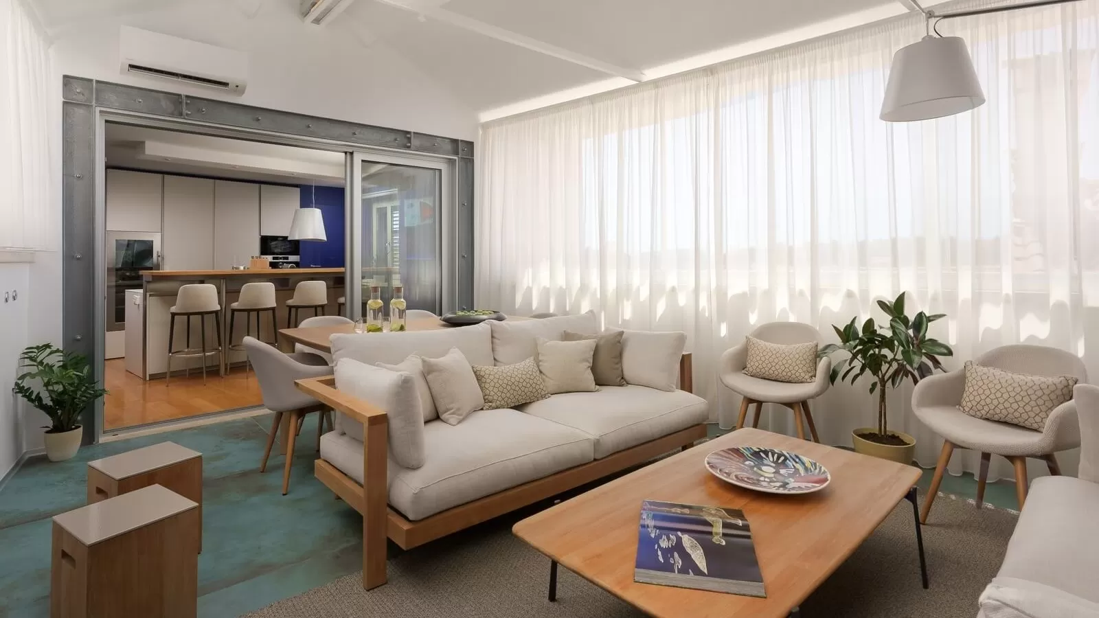 Enjoy the magical sunsets, stroll through the narrow streets of the old town in the evening and enjoy the flair of a former fishing village. Villa Malipiero Residence consists of several floors, each of which is special in its own right. On the first floor you will find the well-equipped fitness room and the wellness area with sauna and a bathroom. Relax here or work off some energy while exercising. Level 2 consists of 2 comfortable bedrooms and 2 modern en-suite bathrooms. On the third level you will find 2 further bedrooms, each with its own bathroom, a vinotheque with a small kitchen and dining table for 6 people. Level 4 has the living area with kitchen and dining area, a library and an outdoor terrace. Here you can enjoy a wonderful view of the sea.