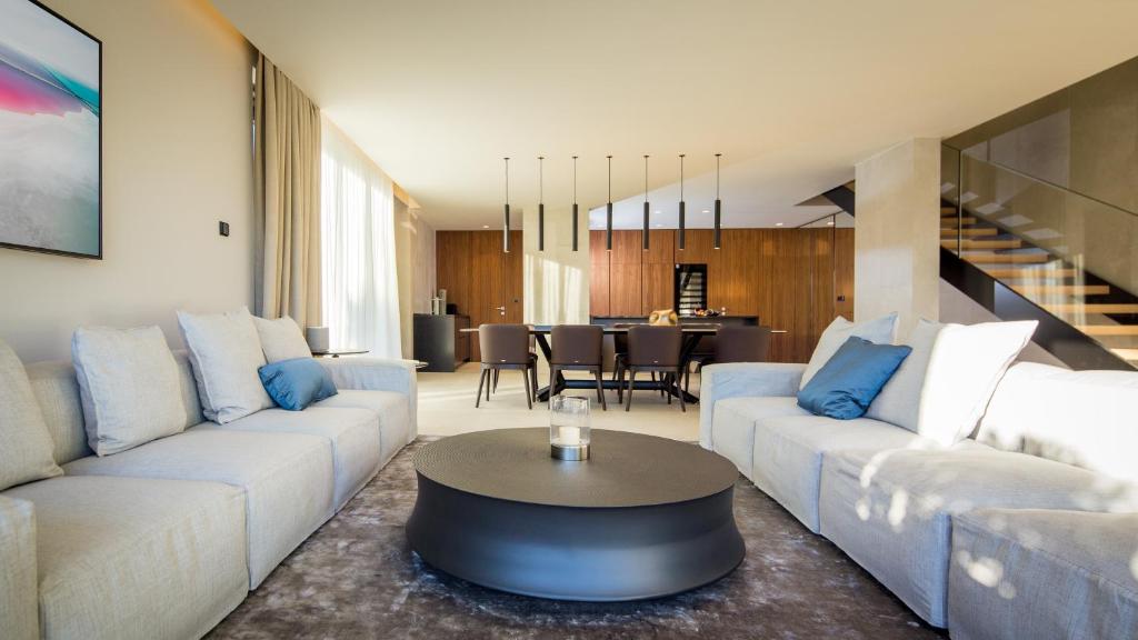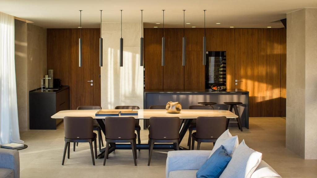 Comfortable Living: The villa provides air-conditioning, bathrobes, and sea views. The kitchen is equipped with modern appliances, and the dining area offers a comfortable setting.