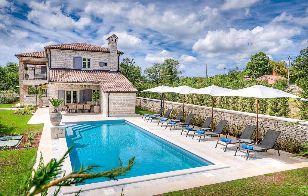 The first floor is entirely dedicated to lavish entertaining. The wonderfully spacious room is divided by a stone archway into living, dining and cooking areas, with huge French windows bringing in an abundance of warm Istrian light. Natural stone walls, wooden beamed ceilings and the magnificent open fireplace create a warm, cozy atmosphere, while the mix of modern and vintage furnishings and exquisite décor provide you with first-class comfort. The four stylishly furnished bedrooms are spread across the upper floor, while the first floor opens directly onto the enticing private pool, a wonderful place to relax and unwind.